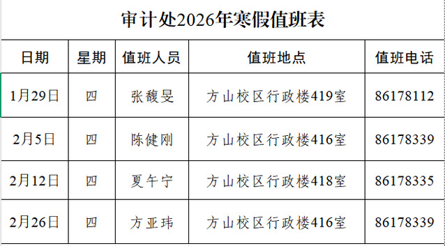审计处2026年寒假值班表